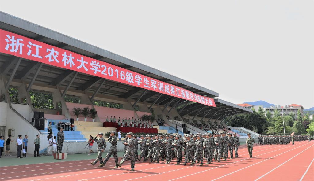 7月11日下午,浙江农林大学2016级新生军训闭幕式暨总结表彰大会在我校东湖校A区操场隆重举行。校党委副书记、军训师政委史永安,副校长、军训师师长沈月琴,中国人民武装警察部队士官学校上校桑永春等出席大会。军训工作领导小组成员、武警士官学校军训教官、全体2016级辅导员及军训学生参加大会。