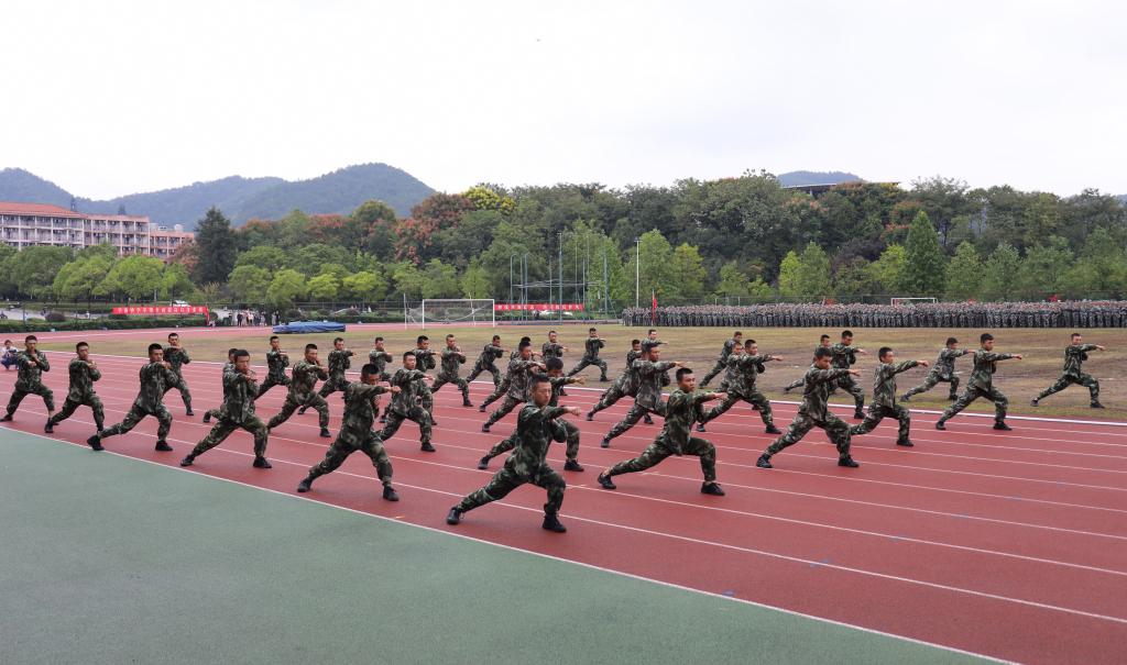 史永安对全体官兵、学生进行了检阅,向中国人民武装警察部队士官学校代表赠送锦旗,并高度赞扬了士官学校为军训所付出的努力。各营学生进行了分列式汇报表演。汇演中,各方阵军容严整、步伐矫健,口号响亮,军姿威武,充分展现了同学们过硬的意志品质和军事素养。随后,男生擒敌拳分队为现场带来了精彩表演,全体教官表演了擒敌拳及队列动作,获得现场热烈的掌声。
