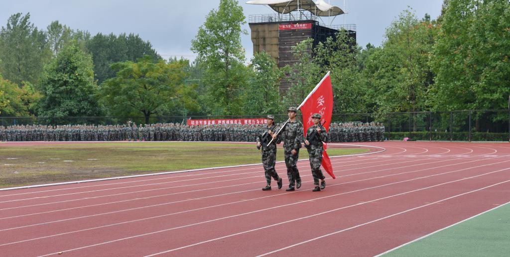 2017级学生军训成果汇报在庄严肃穆的国歌声中拉开帷幕。