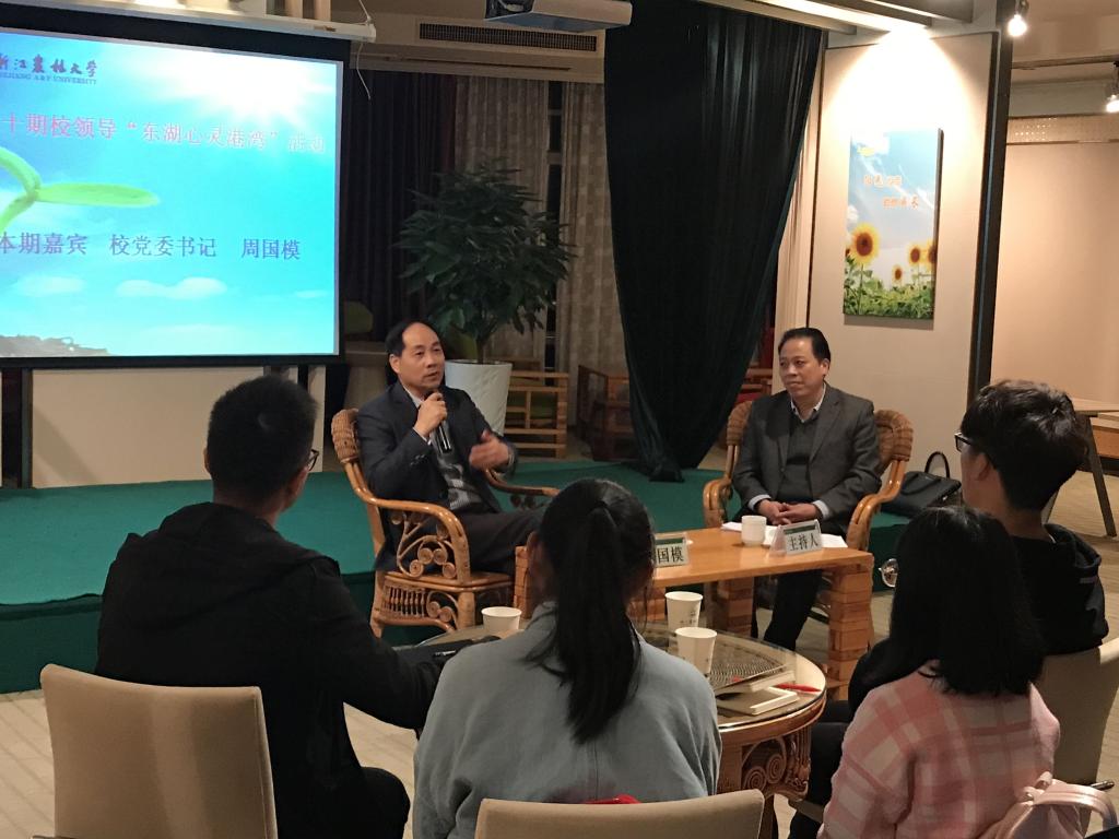 11月15日晚,校党委书记周国模作为嘉宾出席第二十期校领导“东湖心灵港湾”活动,与学生面对面座谈交流。学工部心理健康教育中心负责人、辅导员、心理中心专职老师以及本科生代表参加活动。