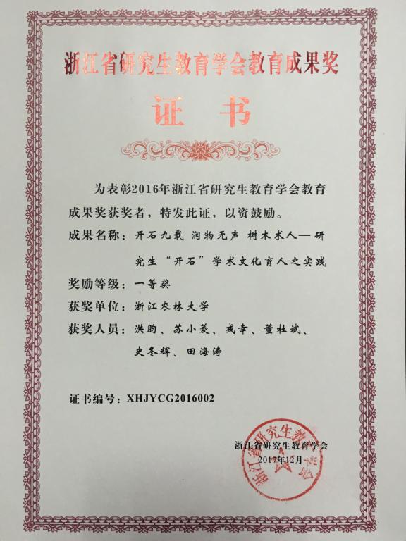浙江省研究生教育成果奖由浙江省学位与研究生教育学会设立,奖励在研究生教育的理论研究与教育教学实践工作中开拓创新、做出突出贡献、取得显著成效的集体和个人。我校2009年提出了研究生“开石”育人理念,将开山琢石成玉比喻为育人成才。九年来,学校积极开展“开石”文化育人实践,培养了一批先进典型,获得了较高的社会声誉。
