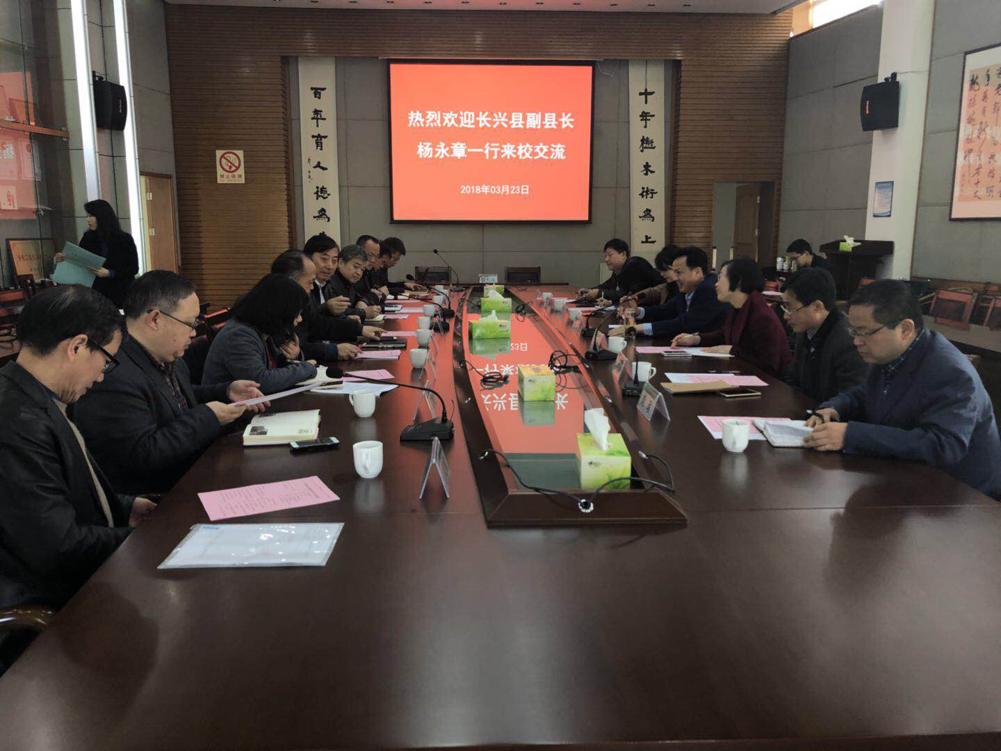 3月23日上午,长兴县副县长杨永章率领县农业局、林业局、法制办、旅委等部门负责人来我校交流合作事宜,副校长金佩华出席座谈。