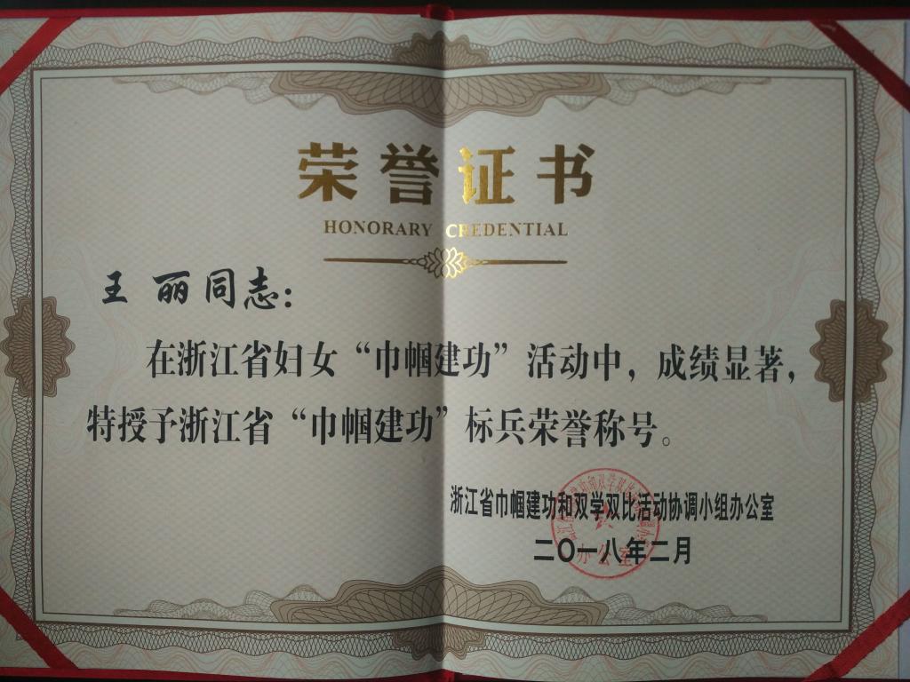 近日,我校王丽老师被授予浙江省“巾帼建功”标兵荣誉称号。