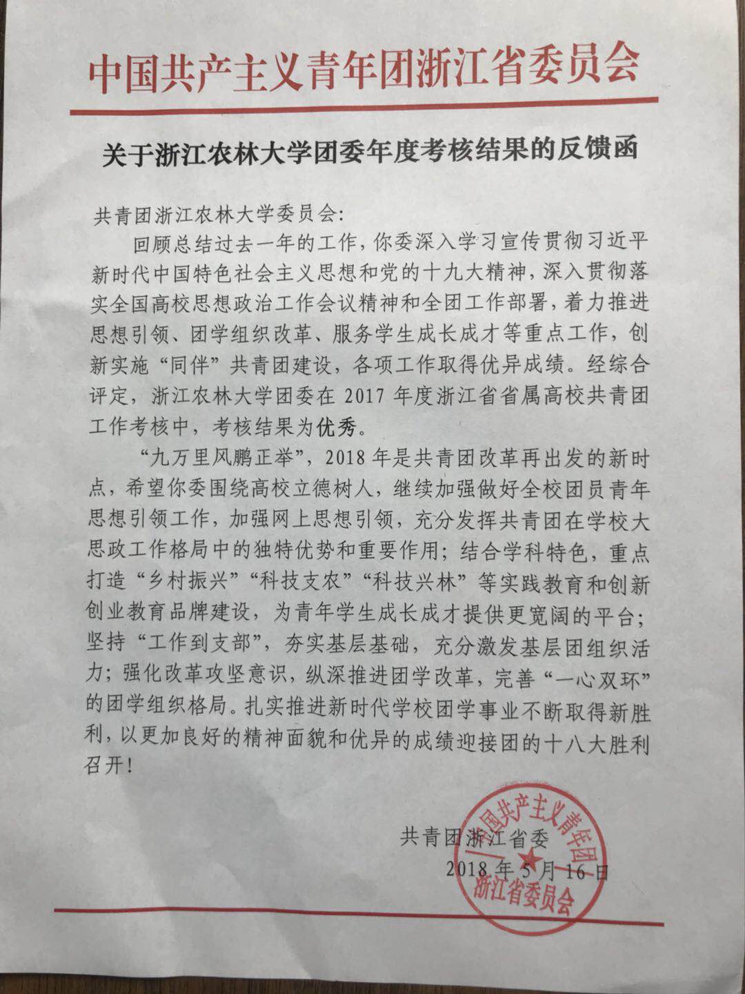 近日,团省委下发《关于浙江农林大学团委年度考核结果的反馈函》,校团委在2017年度浙江省高校共青团工作考核中考核结果为优秀(全省共五所高校),这是我校近几年来首次荣获优秀。