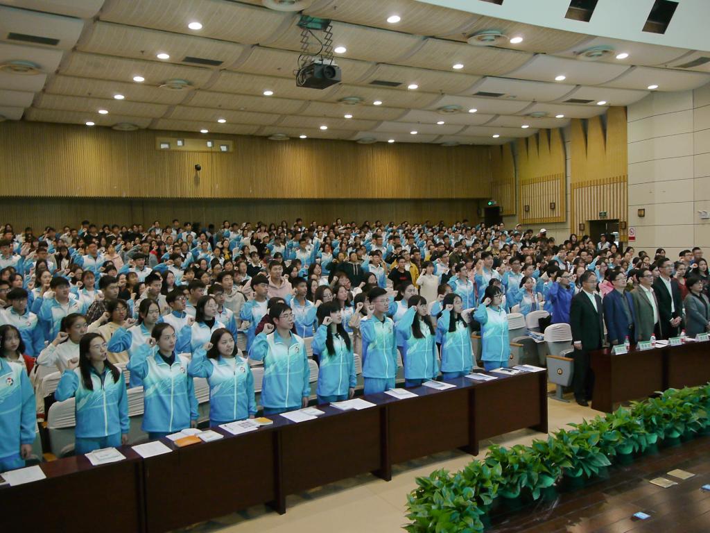 全体志愿者起立并庄严宣誓:“我志愿成为一名光荣的校庆志愿者。我承诺:牢记使命,不负重托。尽己所能,恪尽职守。服从指挥,严守纪律。为校庆添彩,为学校争光”。