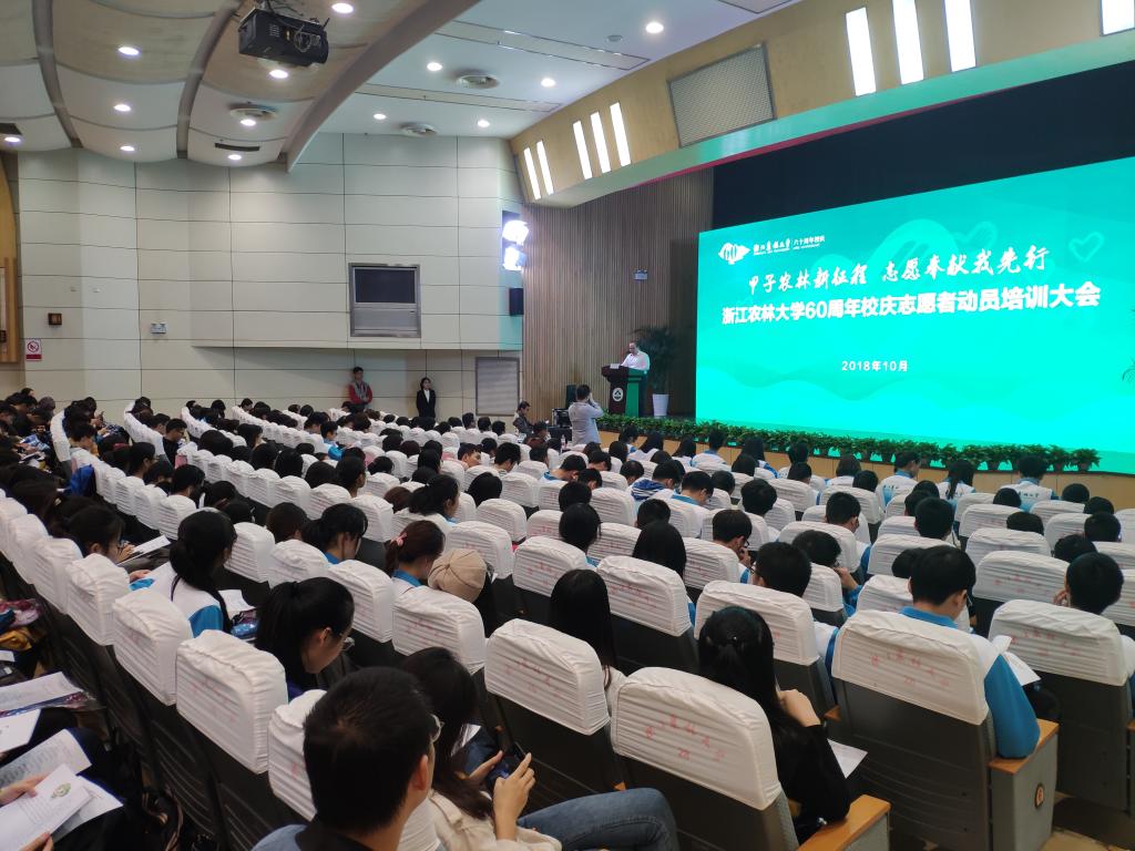 10月14日,“甲子农林新征程,志愿奉献我先行”浙江农林大学60周年校庆志愿者动员大会暨工作培训会在东湖校区图书馆第一报告厅举行。校党委委员、宣传部部长胡祖吉,校党委学工部部长、学生处处长缪鲁加,校友联络办公室主任杨黎明,校团委书记董杜斌等出席会议。浙江农林大学60周年校庆各工作组代表,校庆志愿服务工作组全体人员,志愿者代表等600余人参加大会。