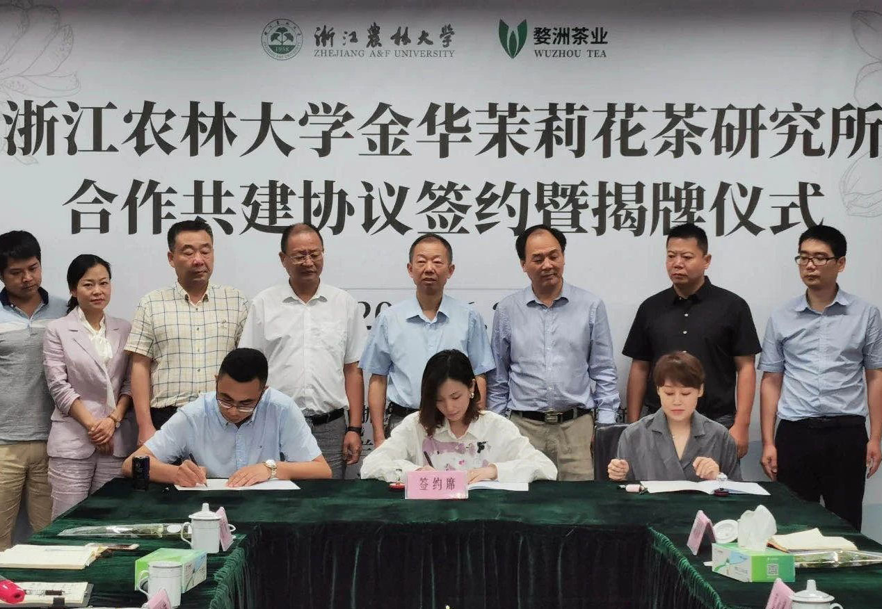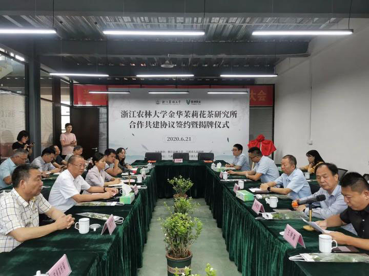 金华茉莉花茶有着悠久的历史,为充分挖掘金华花茶产业潜力,发挥浙江农林大学在茶叶种植、深加工等领域的人才与技术优势,农学院与浙江婺洲茶业有限公司合作共建“浙江农林大学金华茉莉花茶研究所”,加速技术研究与转化、推动浙江花茶产业的恢复和发展。
