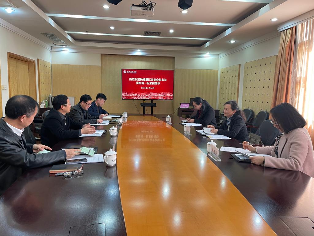 冯尚申对姜红雨一行来校指导工作表示欢迎,并重点介绍了学校的发展情况,对民进浙江省委会一直关心和支持我校发展表示衷心感谢。他指出,学校党委历来高度重视统一战线工作,各民主党派、统战团体在学校教学、科研、管理、服务等方面发挥了重要作用。他表示,学校党委将全力支持民进支部换届工作,也希望支部在民进浙江省委会的关心和指导下,进一步发挥党派优势,立足岗位做贡献,推动学校中心工作。