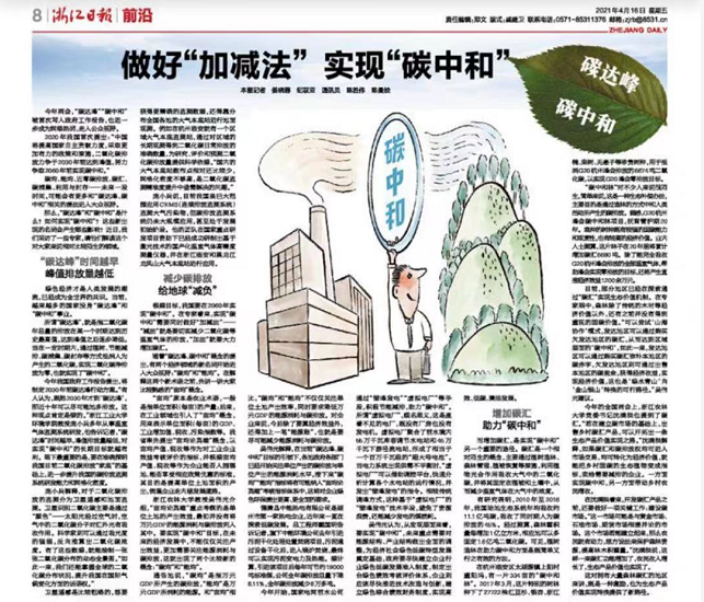 今年两会,“碳达峰”“碳中和”被首次写入政府工作报告,也进一步成为网络热词,走入公众视野。4月16日,《浙江日报》在“做好‘加减法’实现‘碳中和’”一文中,针对“‘碳达峰’和‘碳中和’是什么?”“如何实现‘碳中和’?”等问题采访了我院专家沈满洪教授和吴伟光教授。