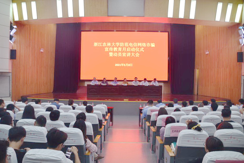5月8日,学校召开防范电信网络诈骗宣传教育月启动仪式暨动员宣讲会,校党委副书记施美红,校党委委员、宣传部部长倪建均,临安区公安分局副局长吕华军出席会议。