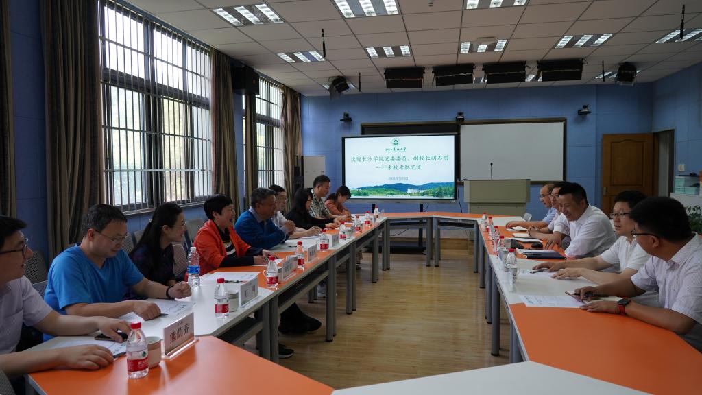 徐爱俊对长沙学院一行表示欢迎,并介绍了我校基本情况和发展成就。徐爱俊指出,学校以数字化改革为牵引,推进治理体系和治理能力现代化;以“十四五”规划及2035年远景目标为引领,全力冲击“双一流”,开启建设区域特色鲜明的高水平生态性研究型大学的新征程。他表示,双方加强合作和交流,希望两校相互学习,携手发展。胡石明对我校快速发展和“一库一表”工程建设成果表示赞赏。他简要介绍了长沙学院的基本情况。希望两校多联系、多交流,深化合作,共谋发展。