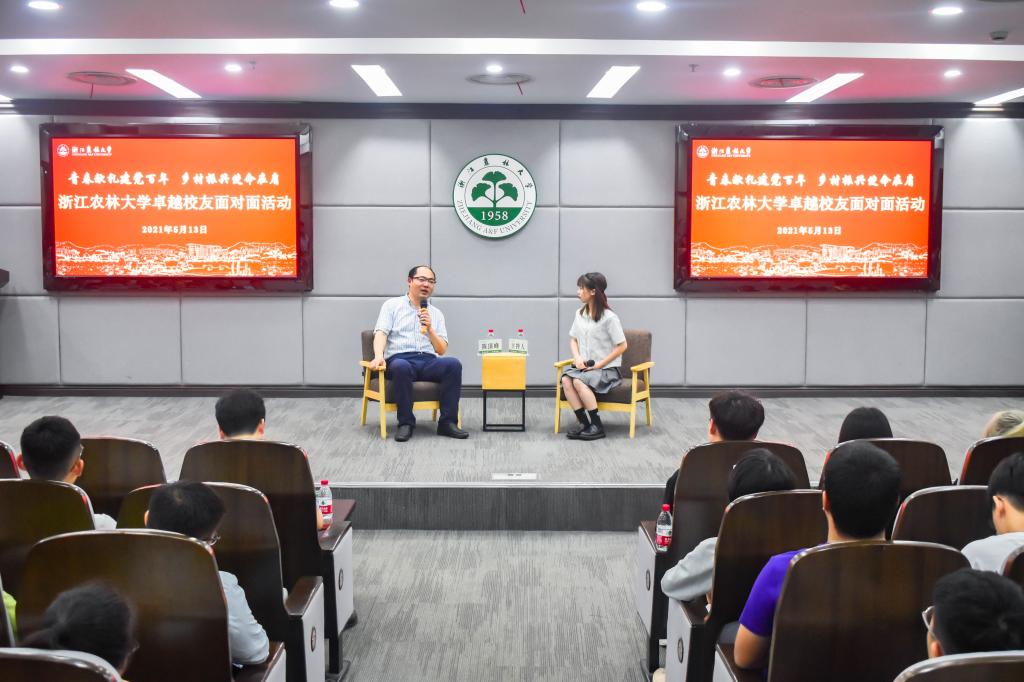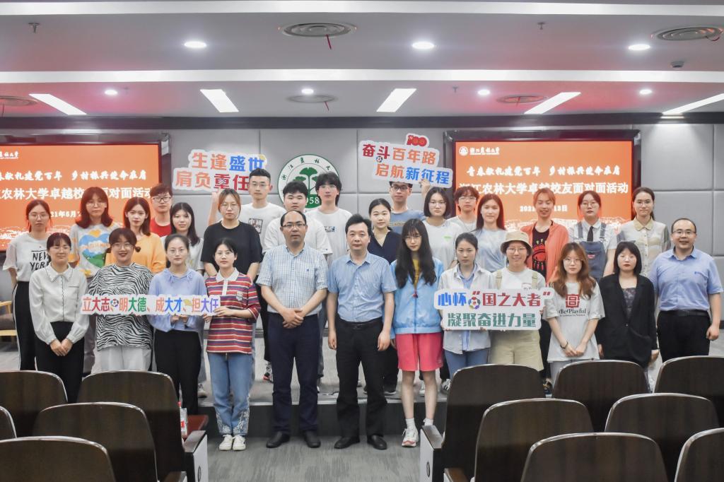 为庆祝中国共产党成立100周年,深入开展党史学习教育,5月13日,全国脱贫攻坚先进个人,我校经济林87级校友陈顶峰受邀来校参加卓越校友面对面活动。副校长胡祖吉会见陈顶峰一行。校党委委员、宣传部部长倪建均出席活动并为陈顶峰颁发了未来卓越校友成长营导师聘书。校友办、校团委相关负责人,各学院团委书记,校、院“未来卓越校友成长营”(“青马工程”培训班)学员150余人参加了活动。