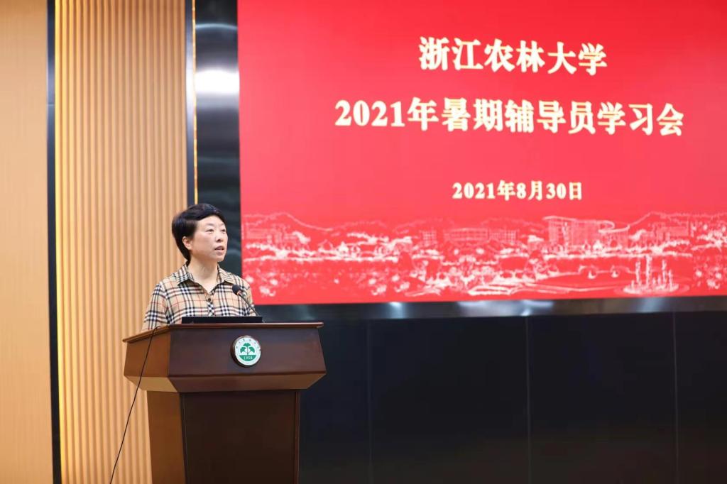 会上,施美红充分肯定了辅导员的工作,并对辅导员的辛勤付出表示衷心的感谢。她表示,实际行动证明了浙江农林大学辅导员是一个有责任、敢担当、能干事的团队。她强调,新时代,党和国家对辅导员赋予更多的期待;新征程,立德树人对辅导员提出更高的要求;新使命,学生成长对辅导员有了更多的诉求;全体辅导员应认清工作形势,强化责任担当,切实增强新时代辅导员的使命感和责任感。她指出,要不忘育人初心,牢记育才使命,努力成为一名让党和国家放心、师生满意的辅导员。一要筑牢红色根基,提高政治自觉,做政治工作的“明白人”; 二要坚持以生为本,关心关爱学生,做学生发展的“贴心人”;三要整合育人资源,提高沟通能力,做学生工作的“协同人”。四要掌握育人规律,提高学术抱负,做思政教育的“探路人”。辅导员需强化师德师风,守好廉政红线,切实营造风清气正、干事创业的良好育人氛围。