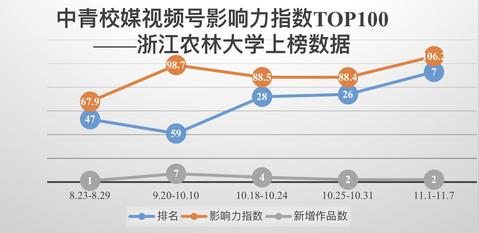 11月8日,中青校媒发布最新一期全国高校(本科院校/职业院校)视频号影响力指数TOP100,我校视频号首次冲进前10名,位居全国本科高校第7位,成为浙江省唯一一个跻身该排行榜前10名的高校视频号。