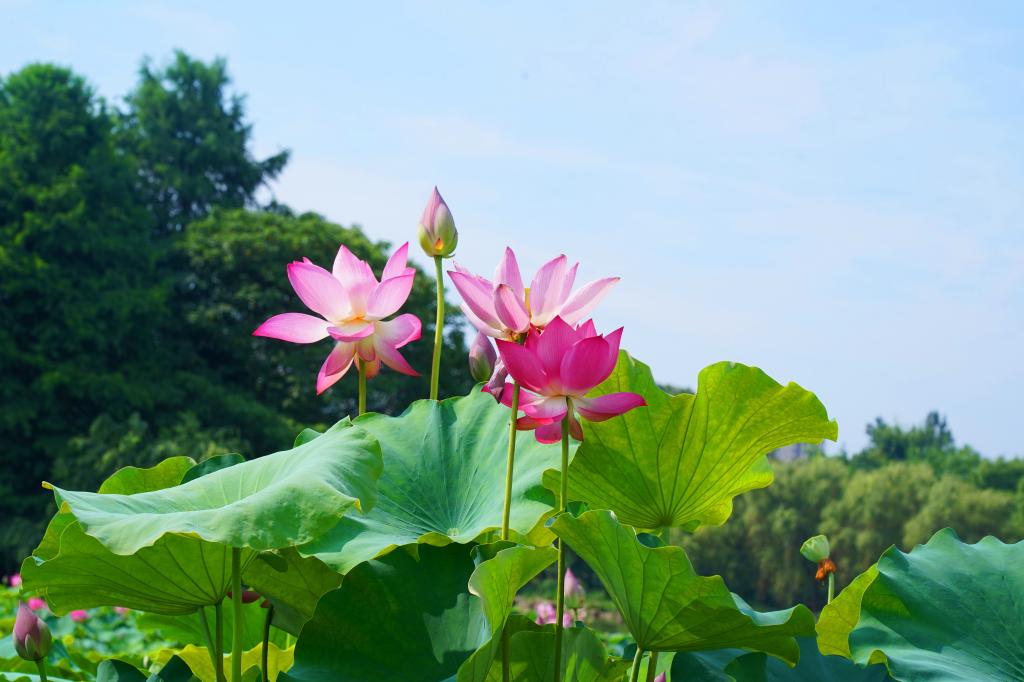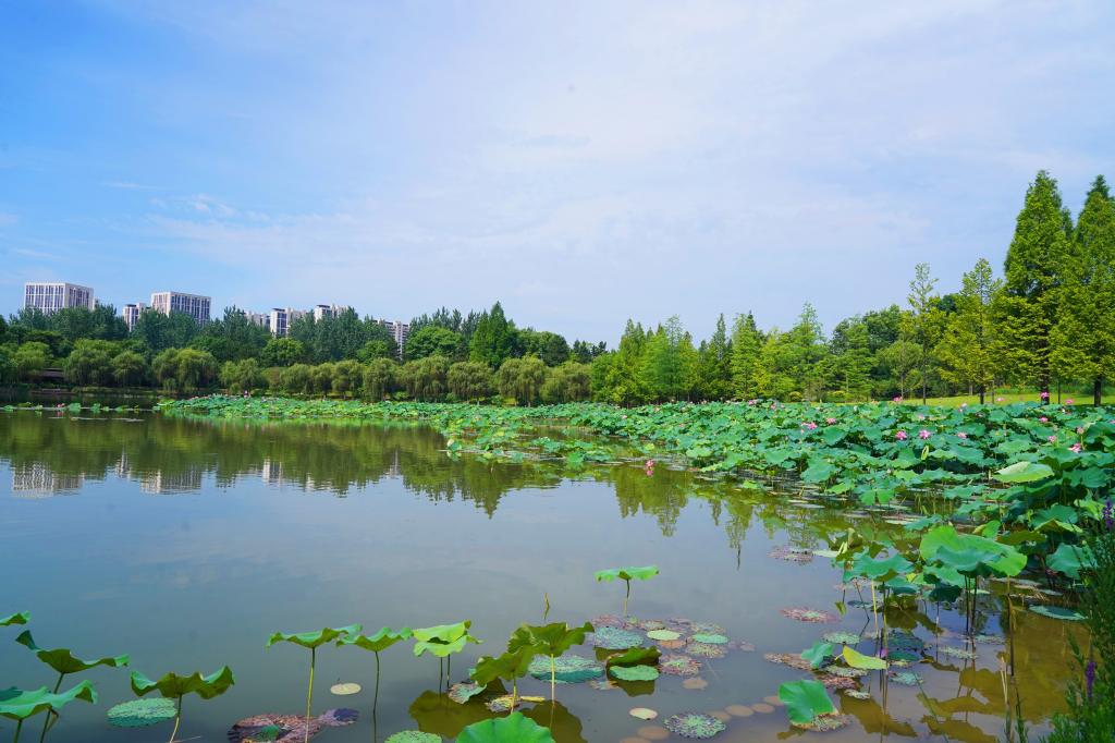 蓝天白云下又接满池叠翠