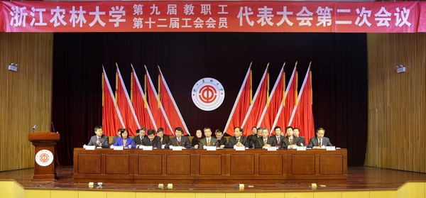 3月16日,浙江农林大学第九届教职工暨第十二届工会会员代表大会(以下简称“双代会”)第二次会议在东湖校区举行。校党政班子成员宣勇、周国模、钟平、沈希、沈月琴、胡祖吉、童晓晖出席大会。校党委副书记方伟、副校长王自勇分别主持会议。