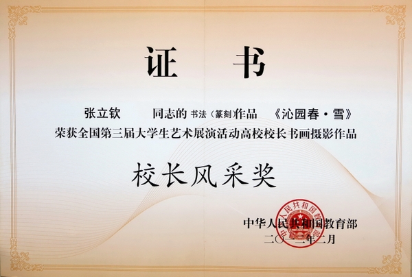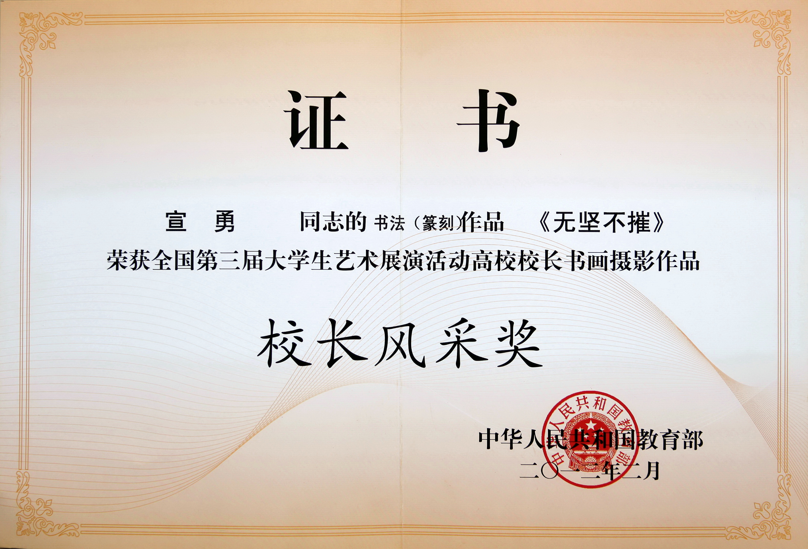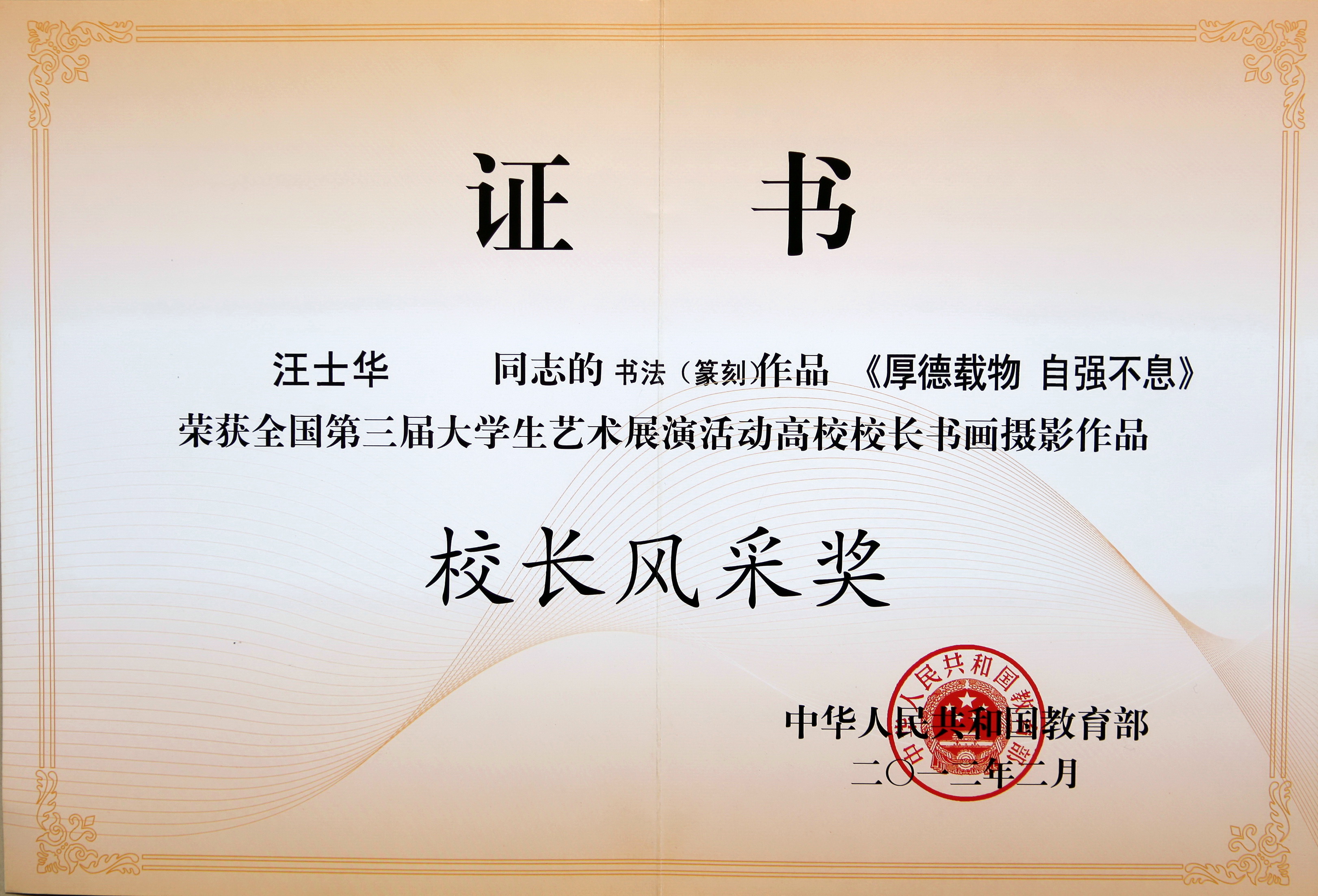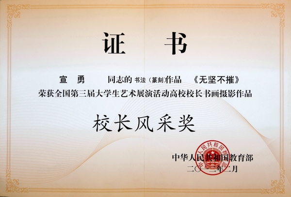 日前,由教育部主办的全国第三届大学生艺术展演活动胜利闭幕。在本次大艺展高校校长书画摄影作品展上,我校党委书记宣勇教授的书法作品《无坚不摧》,党委委员、副校长张立钦教授的书法作品《沁园春·雪》,校党委委员、工会主席汪士华教授的书法作品《厚德载物 自强不息》均荣获校长风采奖。