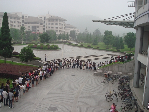 临近期末,为了专心复习功课,很多学生6点多就到图书馆门前排队,以便能够在图书馆“抢”到一个好位置。早上7点多,等候图书馆开门的人就已经沿阶梯排到了百米外,犹如长龙。而图书馆馆长也在同一时间出现在图书馆进行管理疏导,所以尽管排队等候的大学生“源源不断”,却情绪稳定、秩序井然。