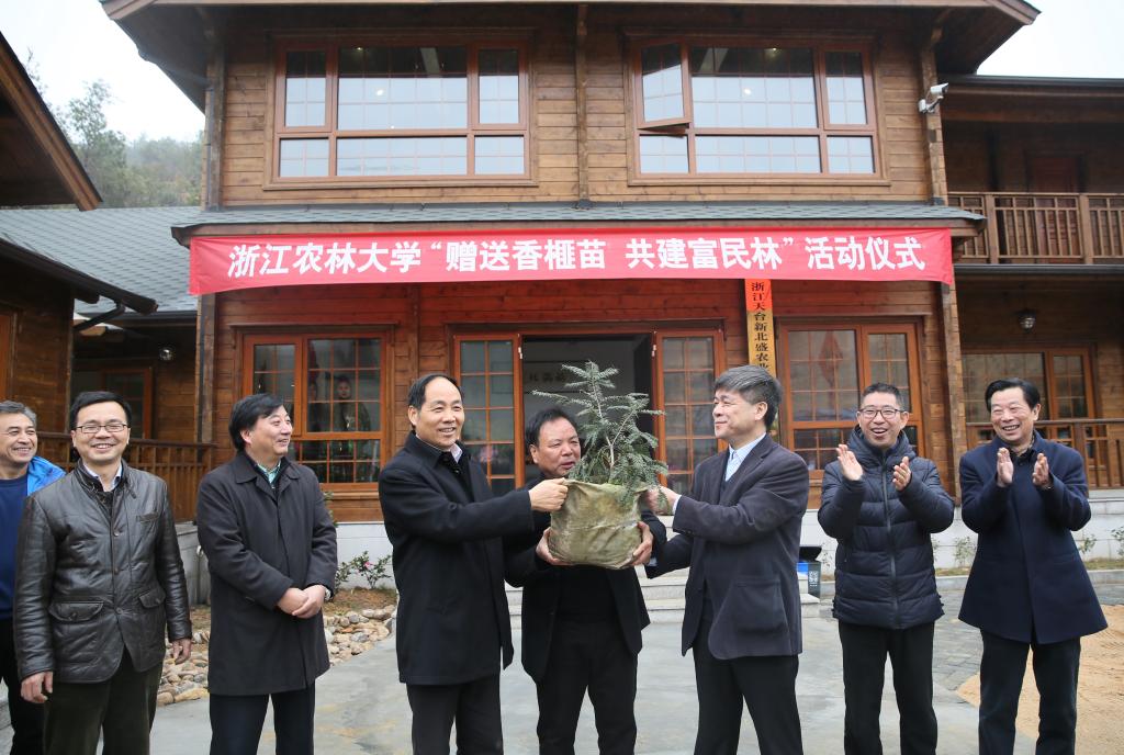 周国模、吕华等领导向石梁镇东溪村农民党员代表、浙江天台新北盛农业科技发展有限公司总经理赵中槐赠送了香榧苗。这次我校与省教育厅开展“赠送香榧苗,共建富民林”活动,旨在进一步深化我校与省教育厅合作帮扶工作,发挥学校科技优势,加强帮扶力度,结合当地实际开展精准帮扶,促进石梁镇农业特色强镇建设,助推农民增收致富。