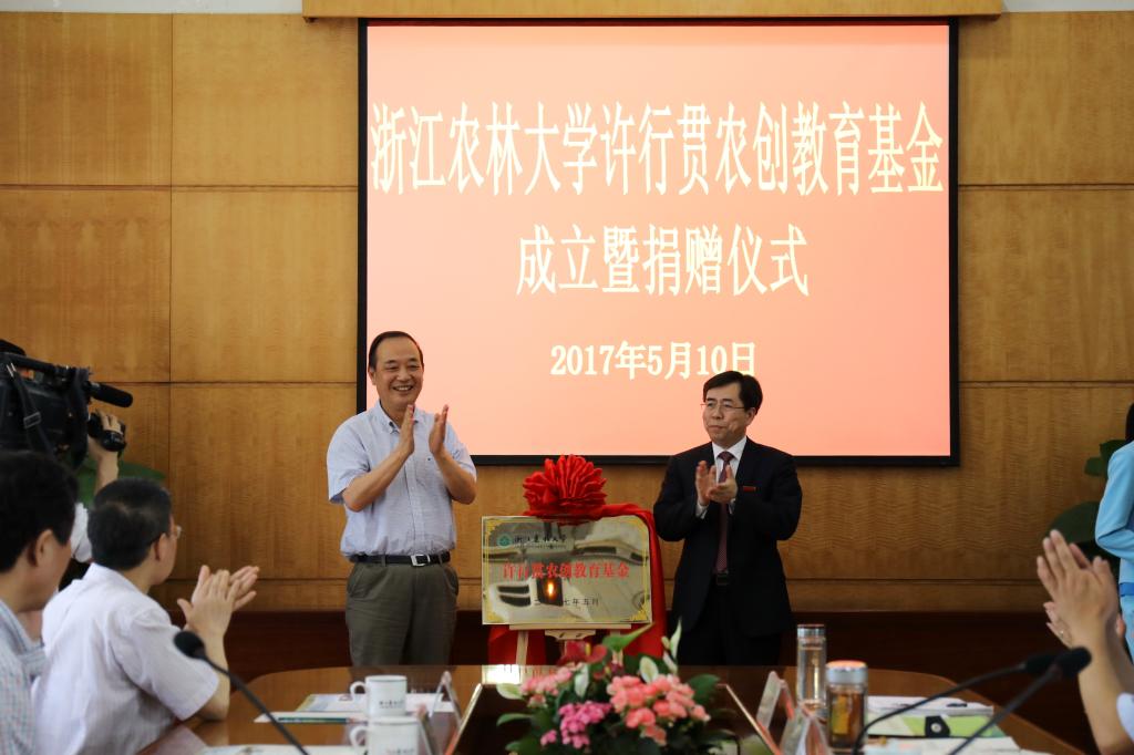 俞仲达与应义斌为浙江农林大学“许行贯农创教育基金”揭牌。
