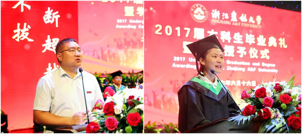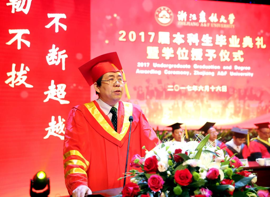 校长应义斌作题为《用信念之光照亮前行之路》的讲话。他向圆满完成学业的同学们表示由衷的祝贺,向多年来为同学们的成长辛勤付出的老师和家长们致以最崇高的敬意。他指出,浙江农林大学是一所秉承“求真、敬业”之训示,将“坚韧不拔、不断超越”的学校精神传承绵延近60年的高等学府,作为一位才入校工作63天的新农林人,每一天都能感受到农林人无惧艰辛、自强不息的必胜信念。