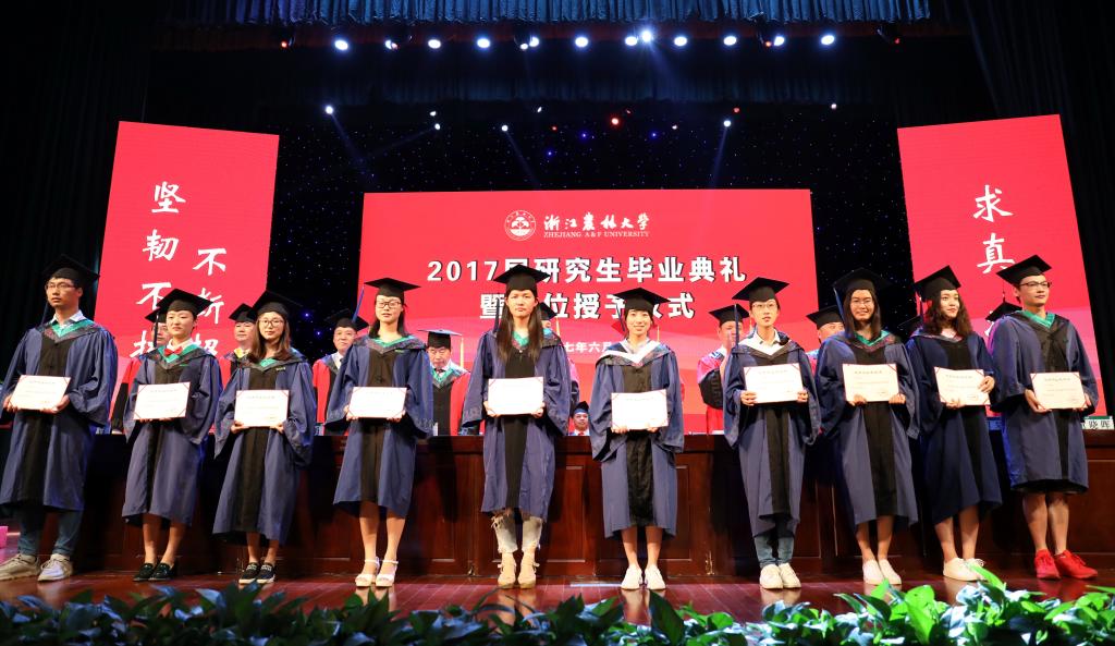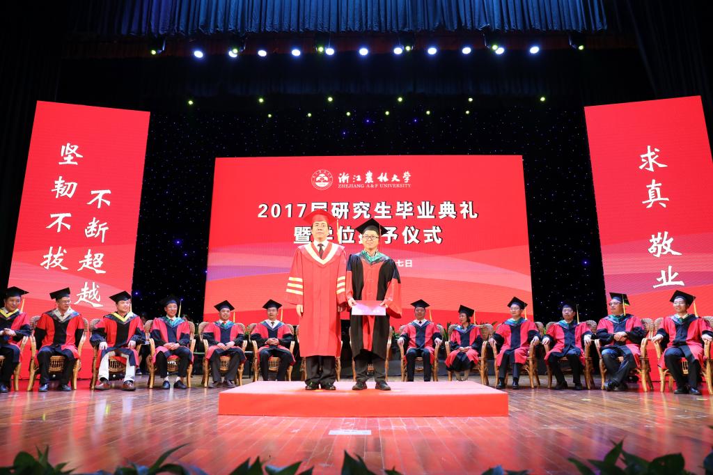 3名首届博士毕业生,496名硕士毕业生按学院依次上台,校长应义斌为每一位毕业研究生颁发学位证书、扶正流苏,并合影留念。相关学院院长和研究生导师见证了学位授予仪式。