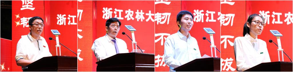 教师代表、第九届我心目中的好老师获得者、经管学院余康教授,校友代表、经济林85届毕业生、浙江省亚热带作物研究所金川所长,在校生代表、农业与食品科学学院研究生陈迈同学,2017级新生代表、环境与资源学院本科生战捷佳同学分别发言。