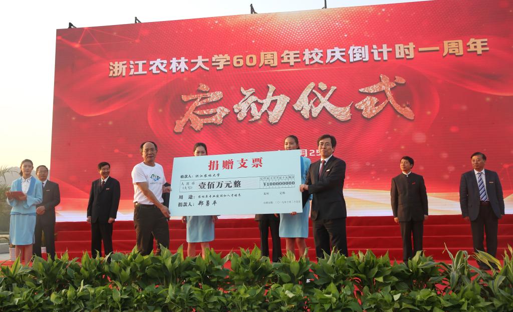 林学81届毕业生、浙江森禾种业股份有限公司董事长郑勇平代表校友作了发言,表达了对母校无限热爱之情。郑勇平校友一直关心母校的发展,曾先后在学校设立了森禾奖学金,建立了森禾园,在母校60周年华诞到来之际,再一次向母校捐赠人民币100万元,用于农林类专业建设和人才培养。