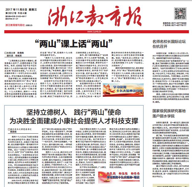 11月8日,《浙江教育报》头版“新思想 新征程 新作为——学习贯彻十九大精神·笔谈”栏目,发表了我校党委书记周国模撰写的题为《坚持立德树人 践行“两山”使命 为决胜全面建成小康社会提供人才科技支撑》的署名文章。