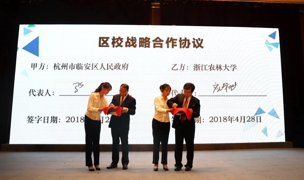校长应义斌与临安区区长骆安全分别代表校、区签订战略合作协议。根据协议,双方将发挥各自在区域社会经济发展中的独特地位和作用,以乡村振兴、产业发展、人才合作和环境保障为重点,以互惠互补互利、共推共享共赢为原则,共推临安城市国际化、产业现代化、全域景区化,共建国家级创新平台、国家级乡村振兴示范区、国家级大学科技园,共享高端人才资源、科技创新资源、信息政策资源,促进临安经济社会和学校综合实力共同发展。双方成立战略合作委员会,建立合作委员会例会制度、合作沟通协调制度、课题合作研究制度、经费保障制度,确保区校战略合作顺利推进、取得实效。