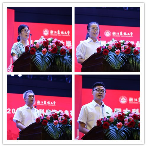 教师代表经济管理学院杨丽霞副教授,毕业生代表理学院吕巧巧同学,毕业生家长代表——农学院王程宽同学的父亲、我校1987届校友王冬米先生,在校生代表工程学院刘建功同学先后发言。