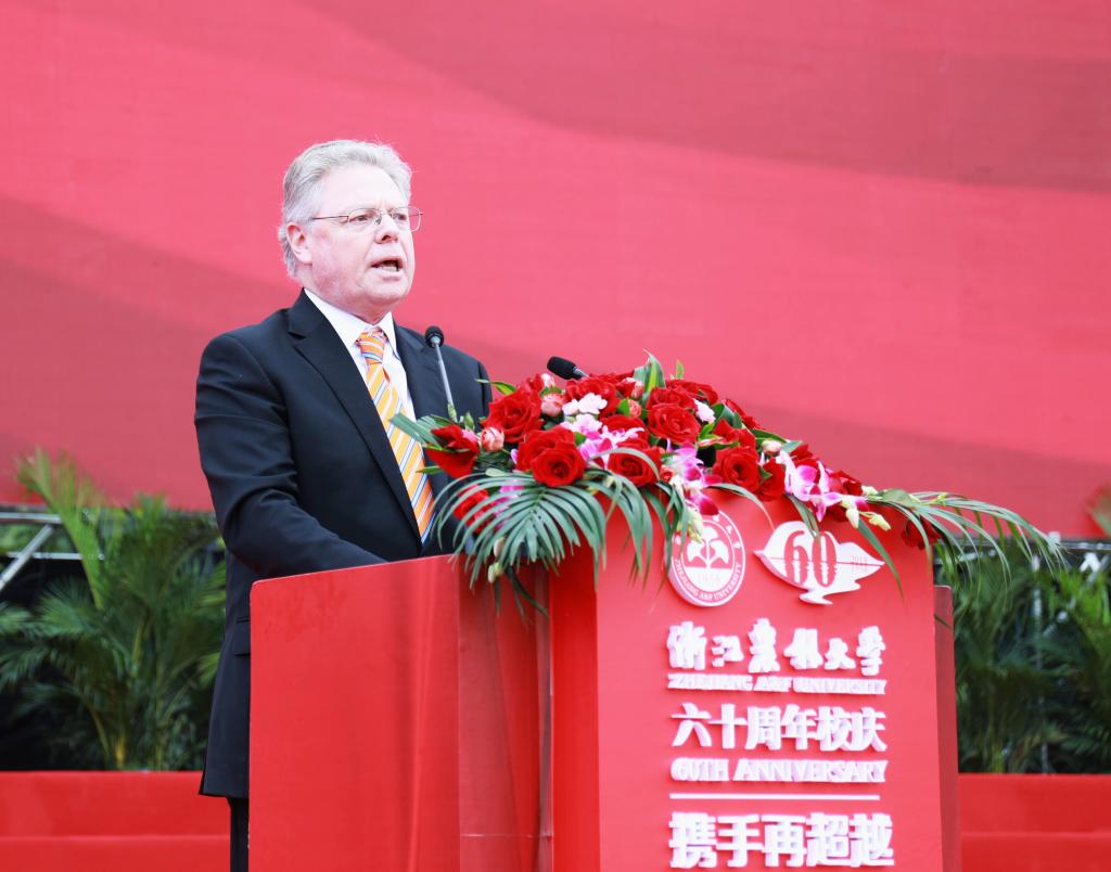 伊利诺伊大学香槟分校副校长及教务长Andreas Cangellaris、国际竹藤组织总干事Hans Friederich分别发言,祝贺学校60华诞,希望继续深化合作,成为亲密伙伴。