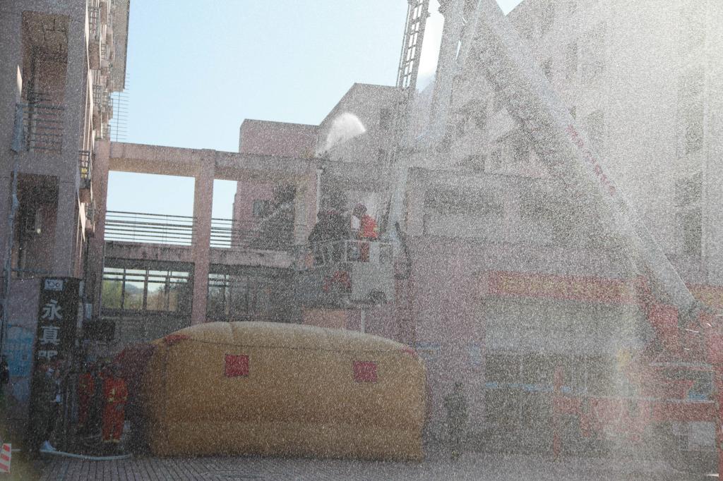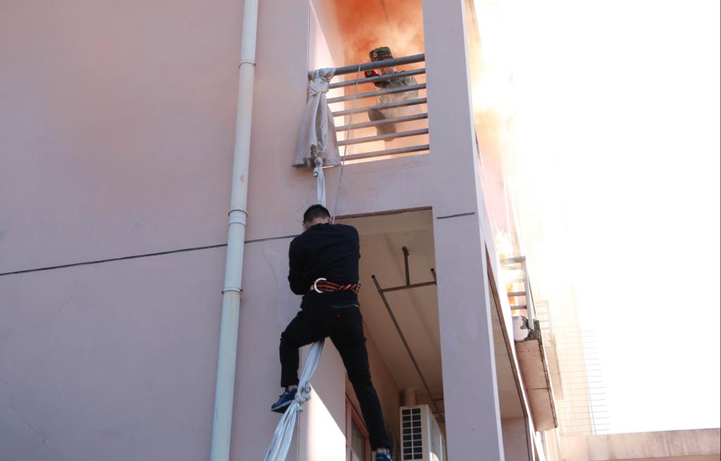 消防灭火救援演练开始。A3、A4学生公寓浓烟四起,学生发现火情后,紧急呼救,公寓管理员立即拨打“校园110”报警并发出火警信号,指挥中心接警后,迅速启动浙江农林大学突发事件应急处置预案,指挥应急队员及校卫队员赶赴“火灾现场”开展灭火、警戒和人员疏散。楼宇疏散引导员指挥被困学生用湿毛巾捂住口、鼻,单列、靠右沿楼道有序撤离。第一梯队学生公寓志愿消防员火速达到现场施救,随后,第二梯队微型消防站消防队员、志愿消防队员紧急到达火灾现场救援。临安区消防大队接警后,出动应急救援车、消防车等多辆消防车和30余名消防官兵,及时赶到现场救援,消防官兵充分运用高空云梯、竹梯、气垫、高空缓降等方式,施救被困人员,待人员有序撤离后,迅速扑灭火患。