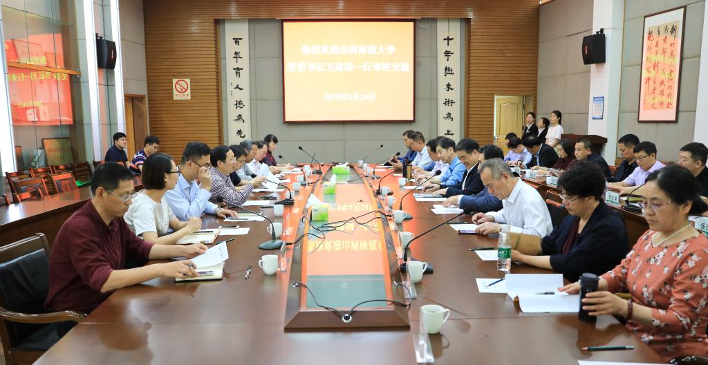 4月24日下午,山西师范大学党委书记卫建国、党委副书记郝勇东、纪委书记刘奎生一行24人来我校考察调研。校党委副书记冯尚申,校党委委员、组织部部长童晓晖陪同调研。