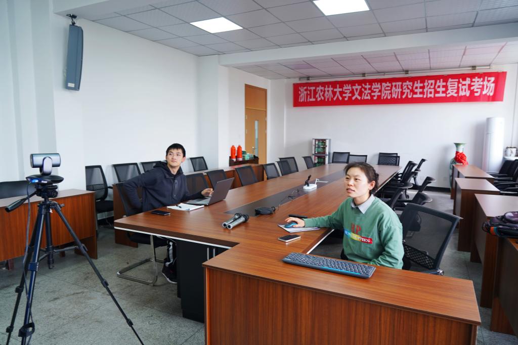 受疫情影响,今年全国不少高校研究生招生复试采取网络远程的方式进行,备好“云端”考场成为面试顺利进行的关键。浙江农林大学各学院、学科,提前做好设备调试,强化技术支持和安全保障,组织模拟演练,确保每个考生网络面试过程都能安全、顺畅、稳定。图为教师在调试网络。
