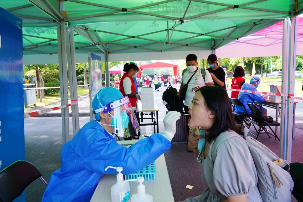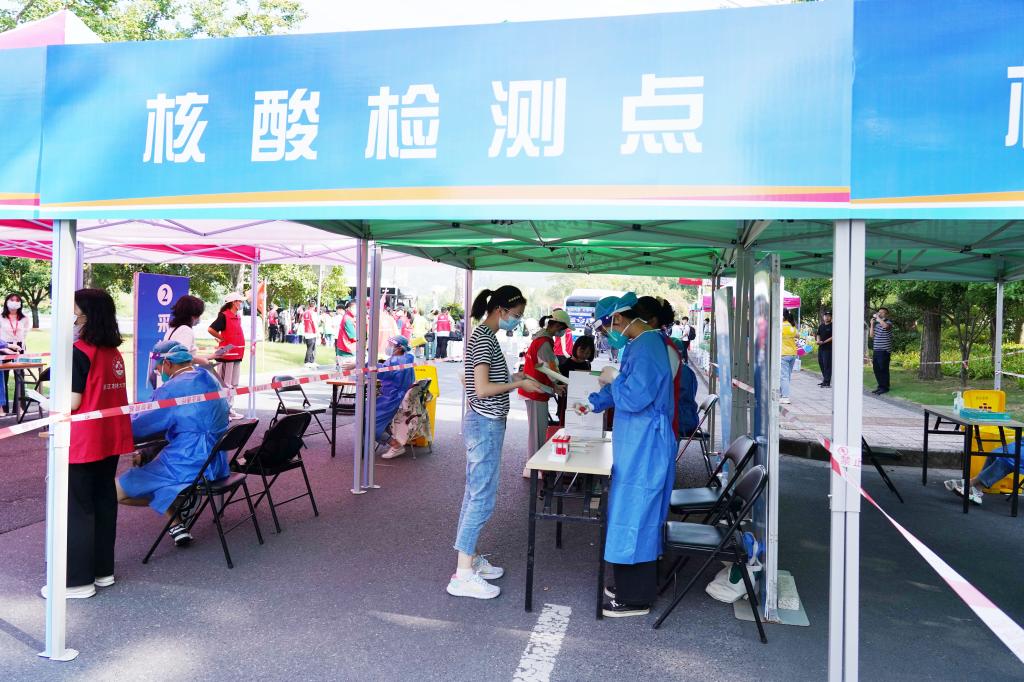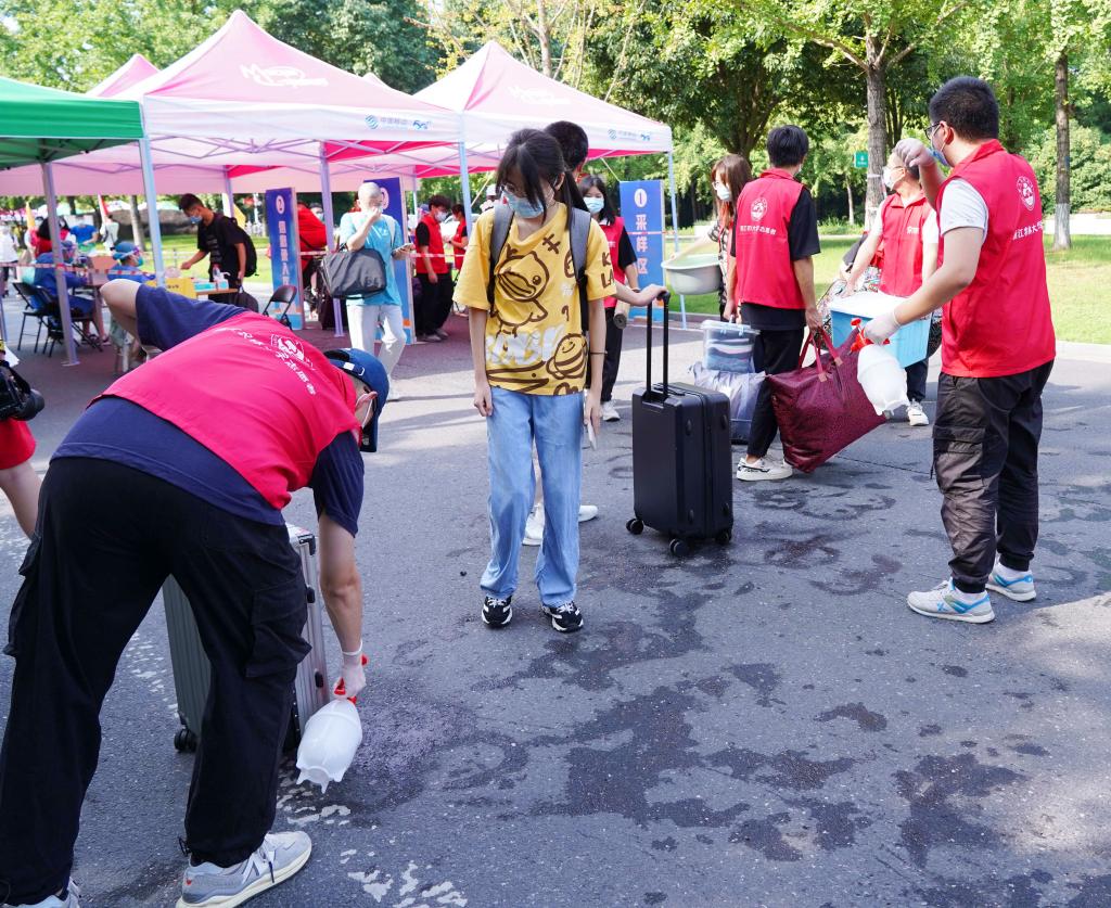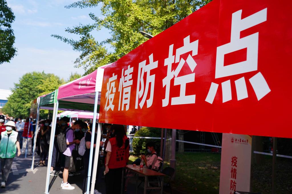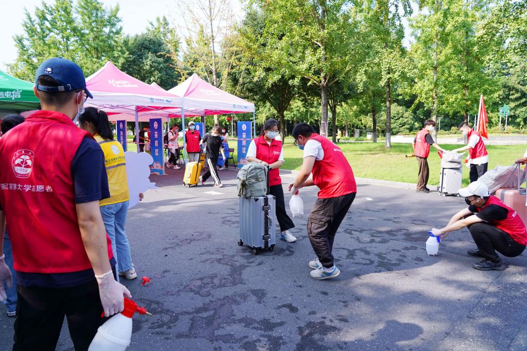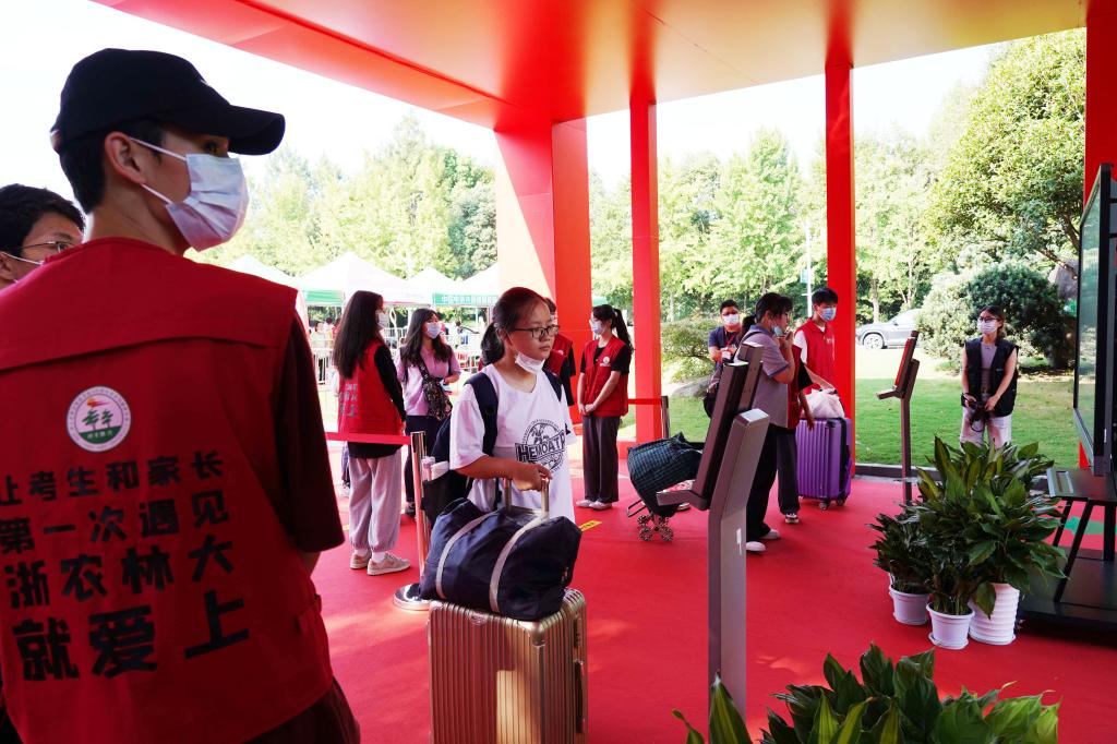 2022年9月11日,浙江农林大学新生在报到现场查验“两码一表”、自动测温、身份核验,完成新生报到手续后立即进行核酸检测、行李消毒。