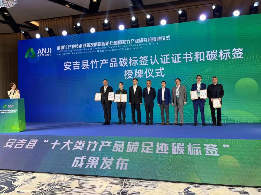 11月4日上午,在全国竹产业技术创新发展高峰论坛上,安吉县正式发布十大类竹产品碳足迹碳标签。这也标志着安吉的竹产品又有了“碳标签”这张新名片。