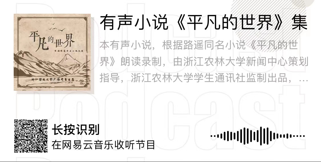 今天,有声小说《平凡的世界》迎来了它的首发。“所有参与到这部作品制作中以及给予它鼓励的人们都值得一句辛苦和感谢,也希望这一部陪伴了浙农林大几个春秋的作品,能够继续为广大师生和听众们带来思考和激励、共鸣和奋进。”浙江农林大学学生通讯社社长项诗瑶激动地说。目前,浙江农林大学版有声小说《平凡的世界》已经在浙江农林大学东湖之声公众号、网易云音乐平台上线,听众可通过相关平台收听全部四十四期剧集。