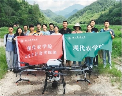 2021年7月,浙江农林大学“植物医生”大学生暑期社会实践团到杭州市一个水稻基地,提供植保无人机喷药服务。