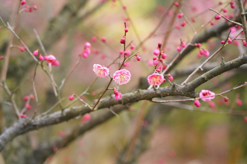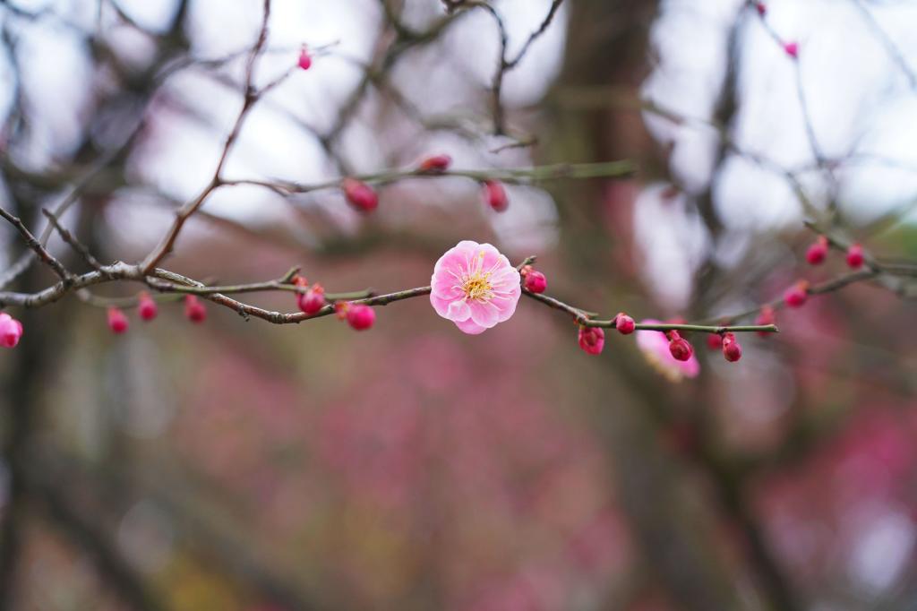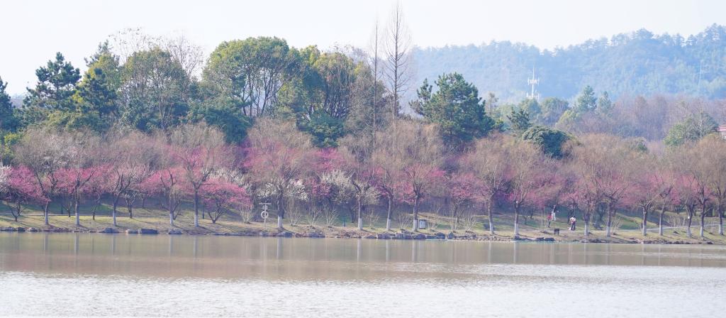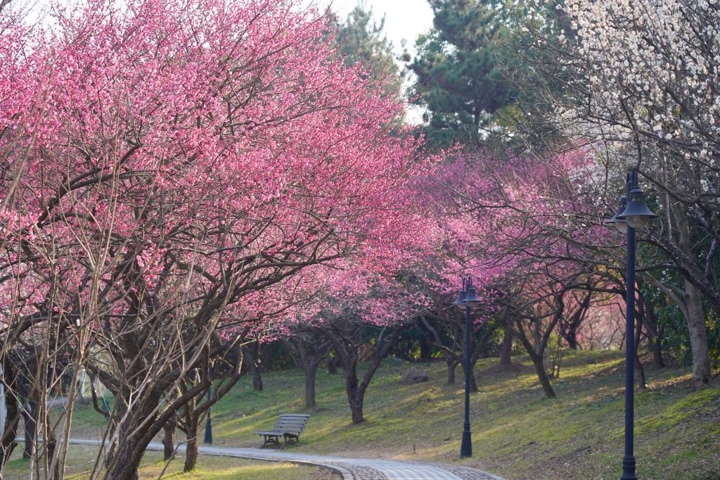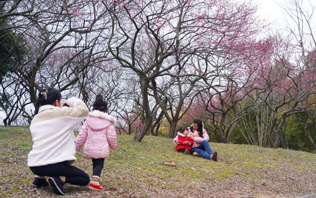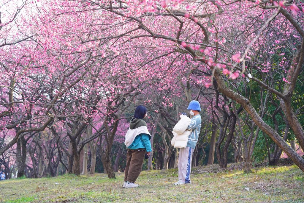 近日,位于浙江杭州临安的浙江农林大学百米梅花长廊内,数千株梅花争相吐香绽放,吸引了开学返校的师生们赏梅闻香、觅春留影。