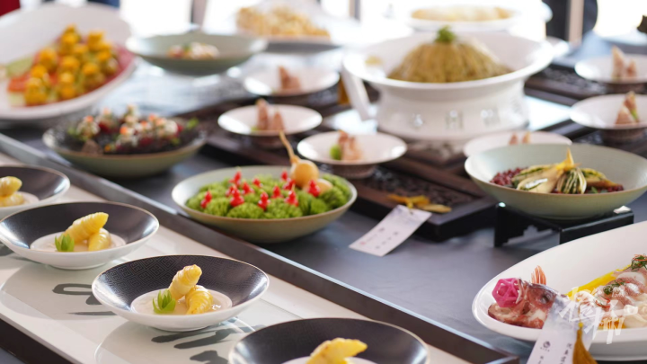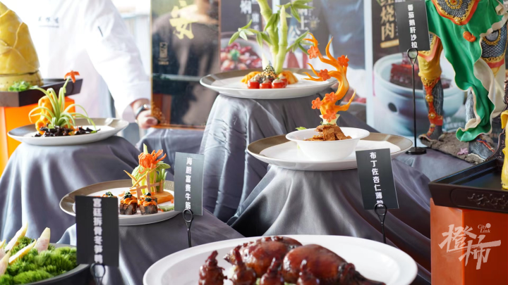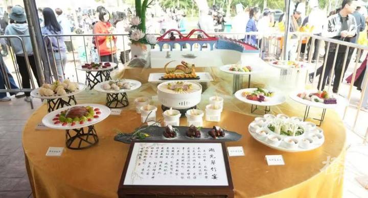 临安竹笋宴、湖光翠竹宴、钱王家宴、天目暖锅宴、临安宴……在竹笋宴展示区,来自学校所在地临安的6家知名餐饮企业,以竹文化元素素材为背景,以笋为食材,运用现代烹饪技术和加工工艺,以炒、蒸、熘、煮、爆、焖、烩等多种方式,辅以各种荤素原料,制作 6 桌全笋宴,每桌都有同学为大家进行讲解。