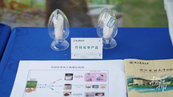 在竹文化科普区,以展板的形式进行竹类知识科普和科研成果展示。浙江农林大学竹子研究院在现场展示了刨切微薄竹、竹纤维、竹酒等各具特色的竹子专利产品。此外,还有很多竹文化产品,如竹制录取通知书、扇子、明信片等。