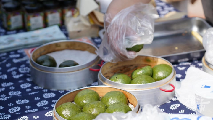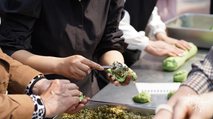 在活动现场,同学和后勤员工一起,以竹笋为食材,自己动手制作“百县千碗”特色点心笋干包和清明果两道点心,蒸好后进行现场分发。