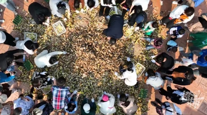 在剥笋比赛的现场,学校早早准备 1000 斤的鲜笋供师生代表现场比赛。100位中外师生两两组合,要求在 5 分钟时间里将笋壳剥干净,剥出的笋就是奖品。如果不需要笋,也可以用它换取礼品。