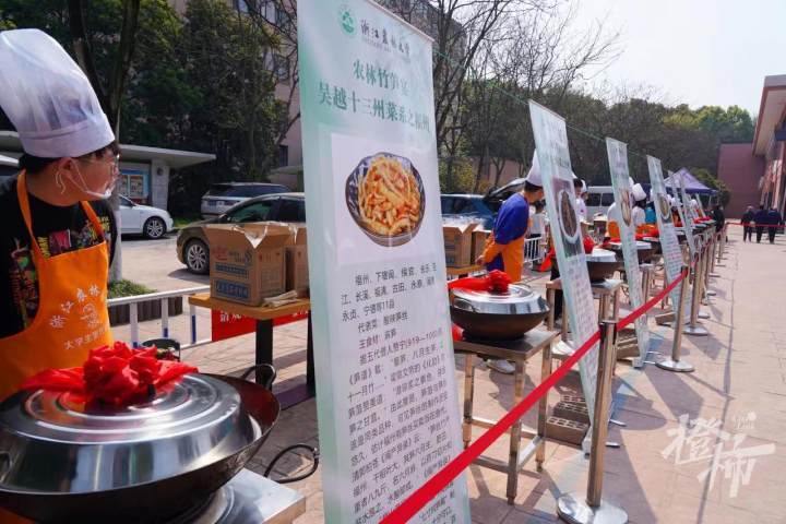 在竹笋宴品尝区,“中国烹饪大师”、该校行政总厨董铭华,带领食堂厨师团队和上劳动教育课的学生,现场烧制13 道笋宴菜。杭州的耕织春笋、越州的邵八珍、湖州的冬笋炖肉、温州的清炒麻笋、台州的毛笋干烧肉……这些都是五代十国时期吴越国下辖的十三州以笋为主要食材的特色菜,全部供师生免费品尝。