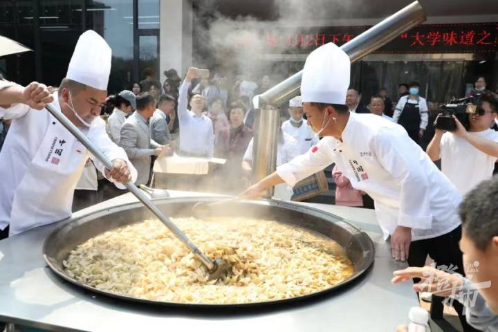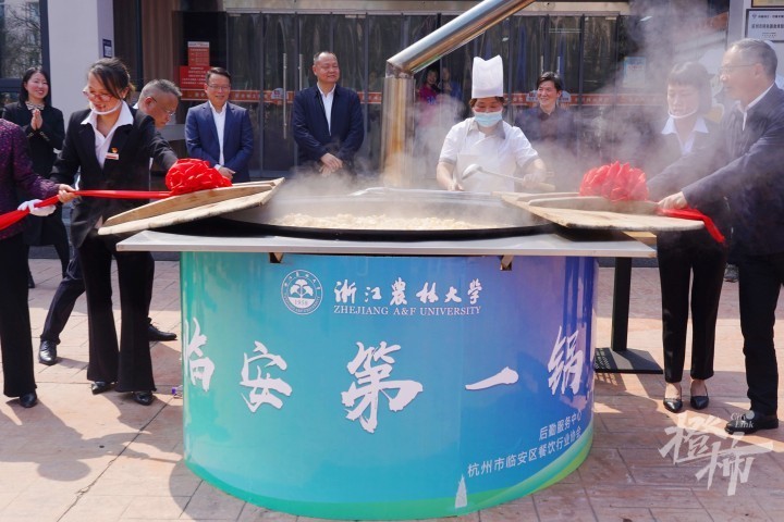 咕嘟咕嘟,热气腾腾的大铁锅里,散发出了浓郁的鲜香。随着主持人一声令下,铁锅的盖子正式开启,师生人手一份,共同品尝刚刚出锅的咸肉春笋,感受这来自春天的味道。“这道菜用了1500斤临安本地的雷笋和300斤遂昌的咸猪肉,用直径1.5米的大铁锅炖了3个多小时。”浙江农林大学餐饮部的叶经理说。