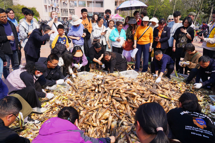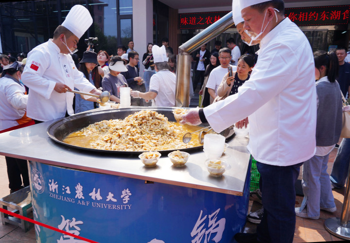 当天,浙江农林大学用超大铁锅炖1800斤鲜肉春笋供学生免费尝“鲜”,还举办了一系列和笋竹有关的活动,引导师生感受笋竹文化、体验竹科技。现场活动包括100名师生分成50个小组,限制5分钟剥好了1000多斤竹笋;现场烧制13道特色笋宴菜,而且都五代十国时期吴越国下辖十三州的特色菜;临安知名餐饮企业以笋为食材、运用现代烹饪技术和加工工艺,以炒、蒸、熘、煮、爆、焖、烩等多种方式制作的6桌全笋宴;来自浙江、四川的10多家企业带来的竹笋、竹酒、竹等各类笋竹产品。