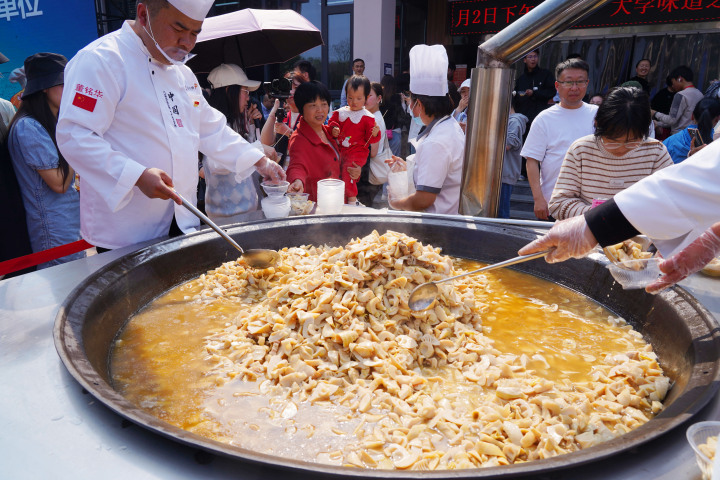 一口直径达1.5米的超级大铁锅里,由1500斤春笋和300斤咸肉炖了好几个小时的咸肉春笋热气腾腾,散发着浓郁的鲜香,引得排队的师生垂涎欲滴。随着主持人一声令下,铁锅的盖子正式开启,师生人手一份,共同品尝刚刚出锅的咸肉春笋,感受这来自春天的味道。