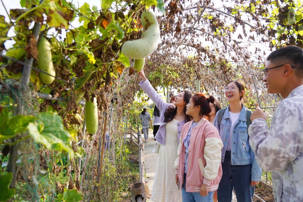 2022年11月2日,浙江农林大学农作园里,几名学生正在观赏丰收的农作物。
