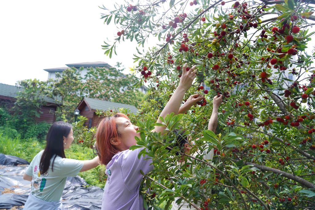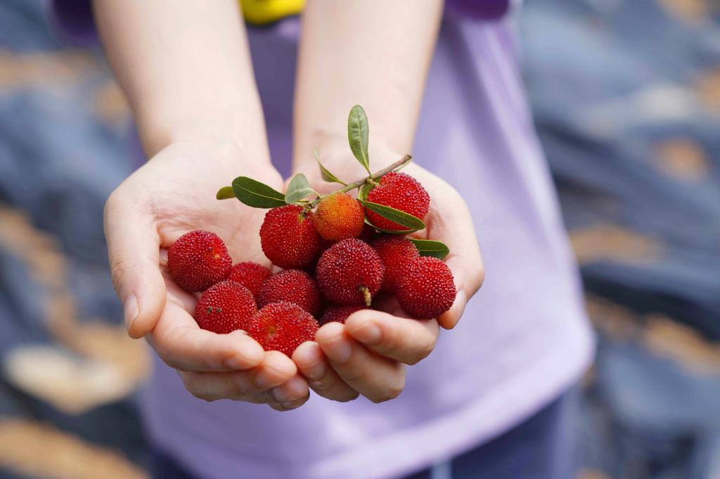 师生在校内实践基地果木园里采摘刚刚成熟的杨梅。